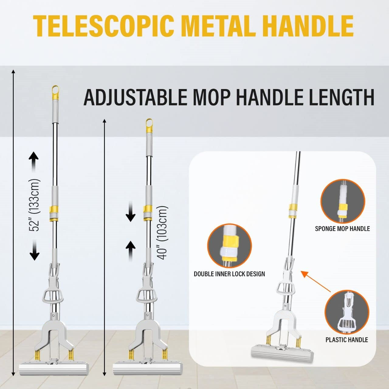 Controlled and complete squeezing With Removable and replaceable mop head that will not scratch or mark.